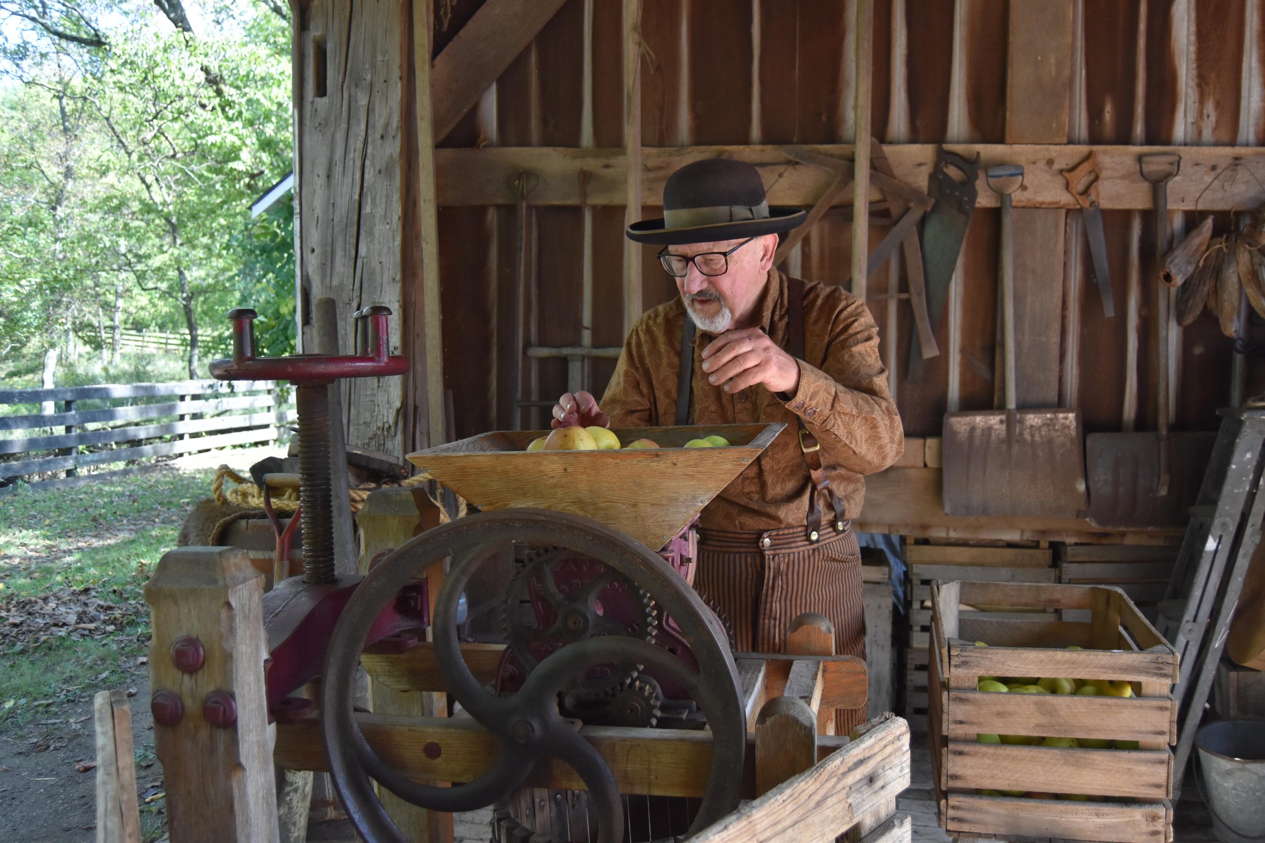 Volunteer Dave Pritcherd places less than perfect apples into the cider mill to crush the apples and create juice that can then be made into cider. In the 1800s most cider was fermented for safety and the whole family would drink it. Cider can also be used to make apple butter.