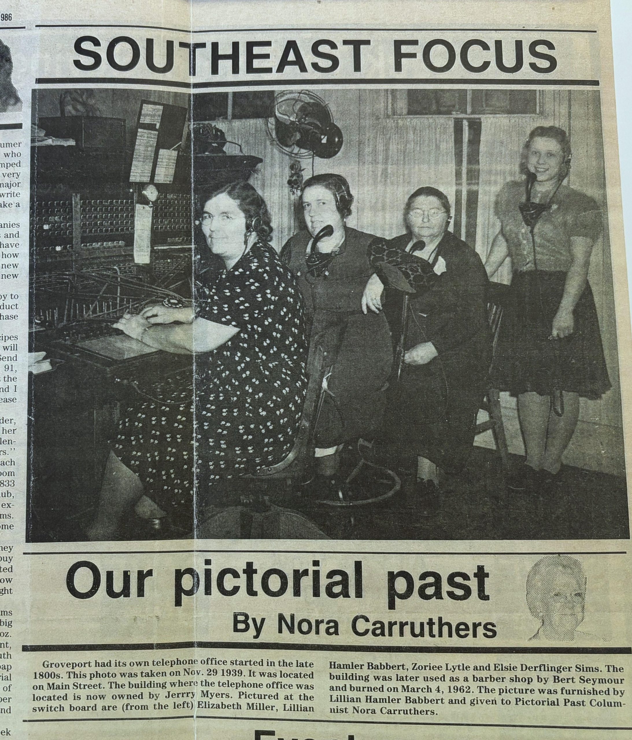 Groveport had its own telephone office in the late 1800s. This photo was taken on Nov. 29, 1939. It was located on Main Street. The building where the telephone office was located is now owned by Jerry Myers. Pictured at the switch board are (from the left) Elizabeth Miller, Lillian Hamer Babbert, Zorice Lytle and Elsie Derflinger Sims. The building was later used as a barber shop by Bert Seymour and burned on March 4, 1962. The picture was furnished by Lillian Hamler Babbert and give to Pictorial Past Columnist Nora Carruthers.