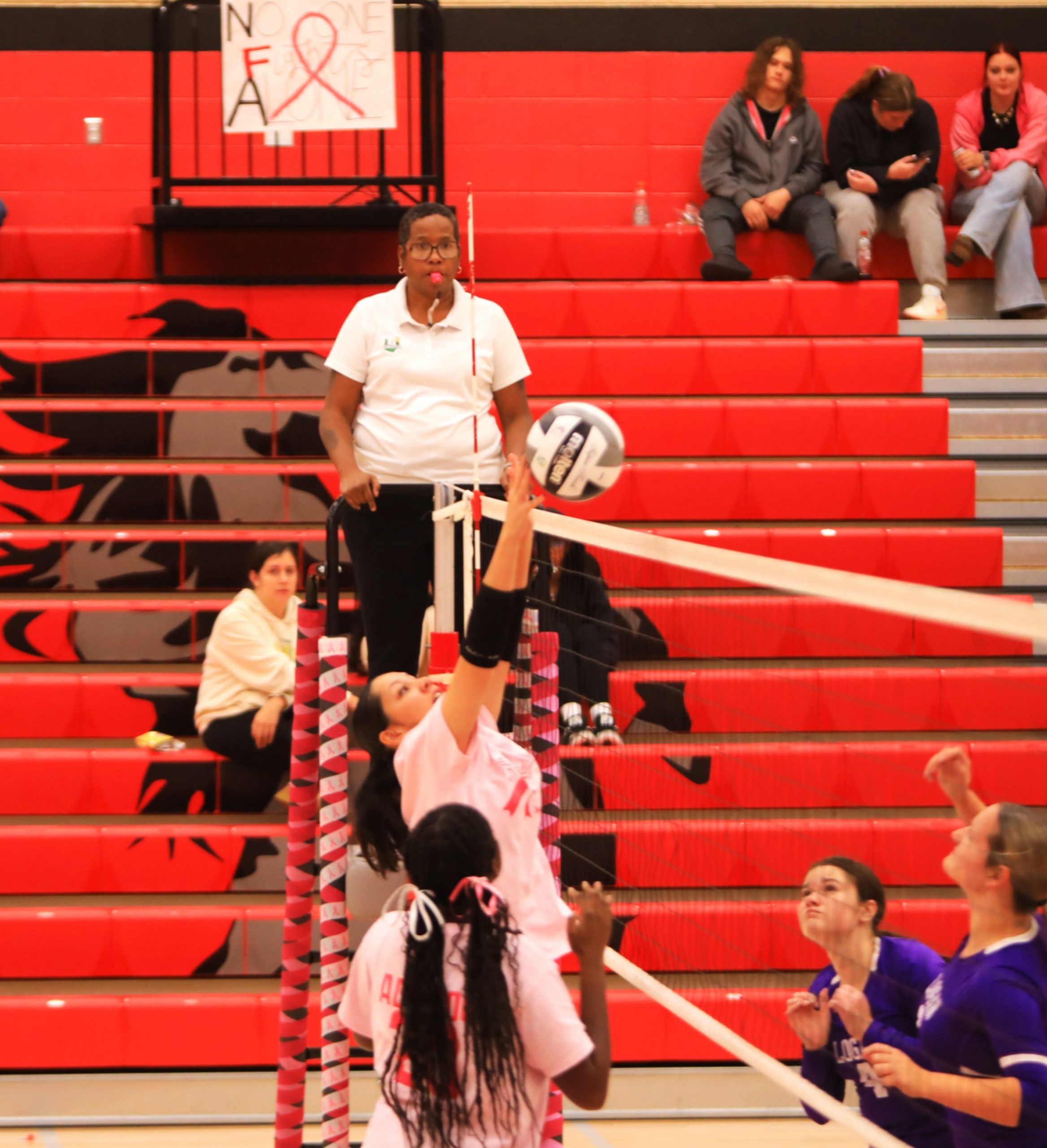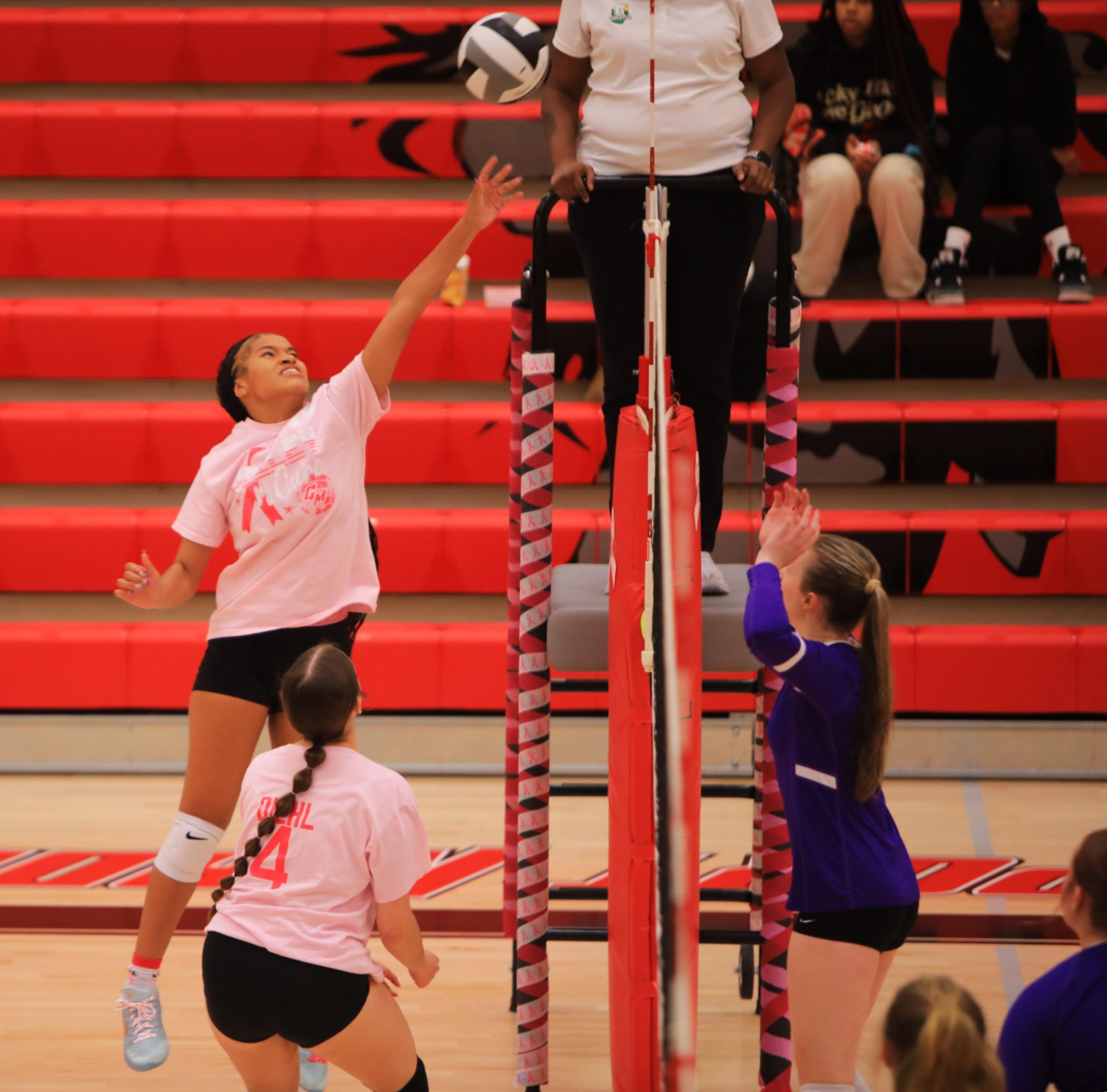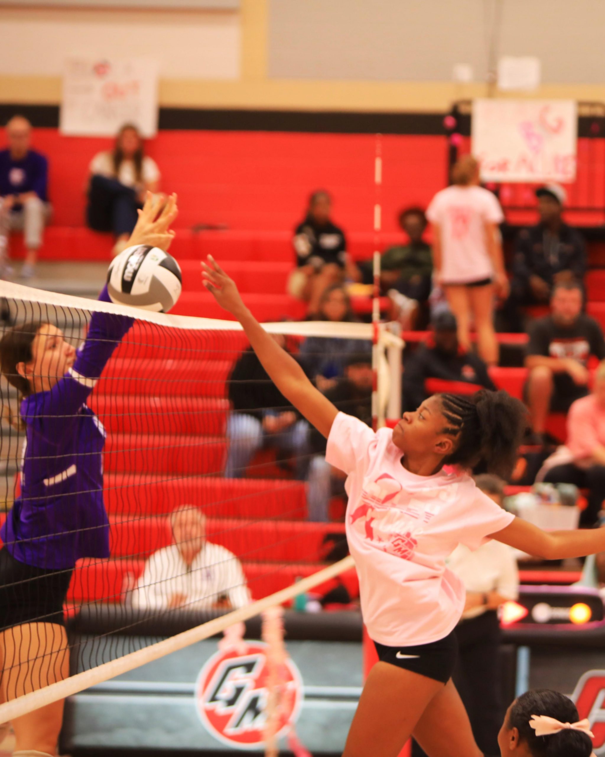 Senior Porsche Yancey controls the ball at the net for Groveport as they took on Logan High School for the Oct. 7th Volley for the Cure.